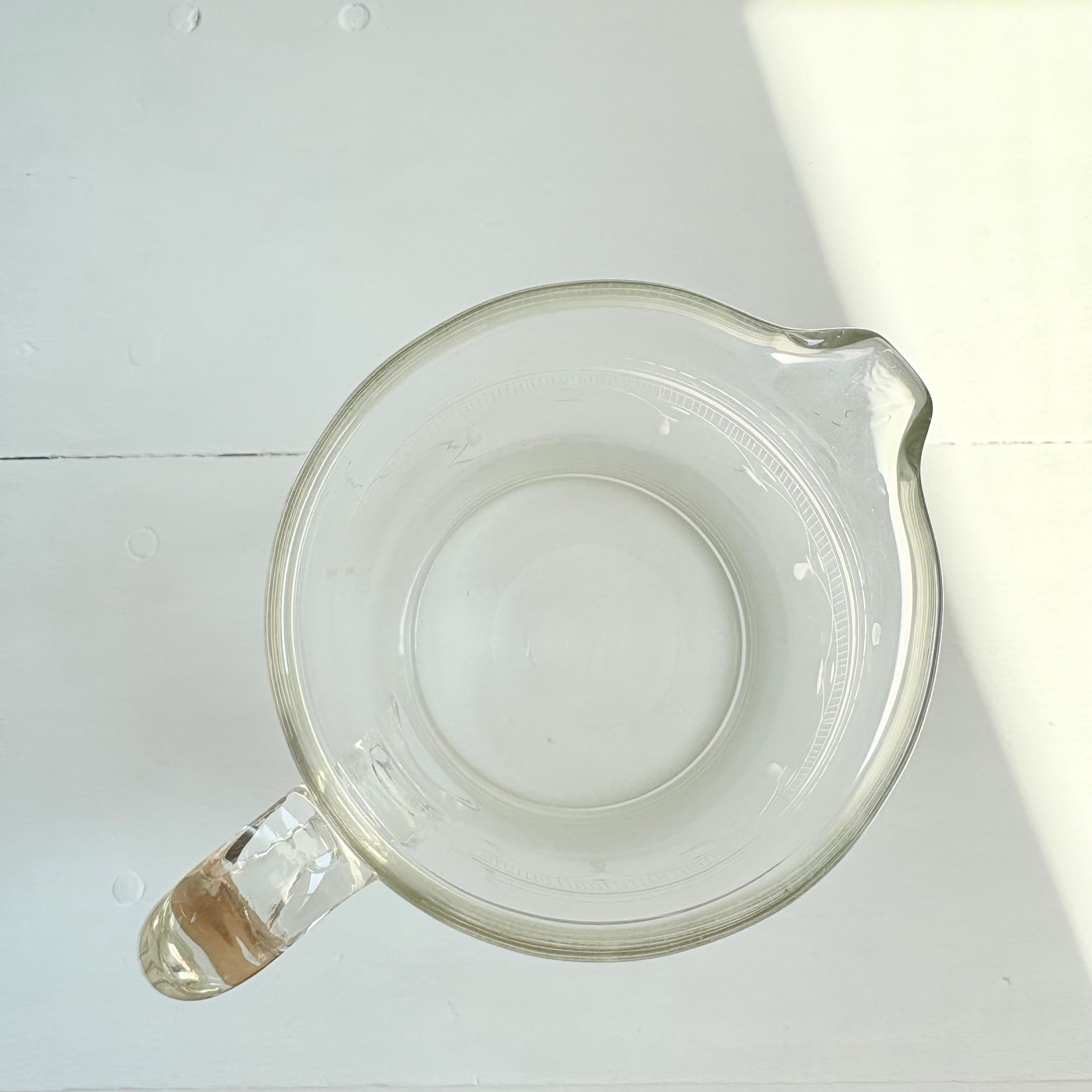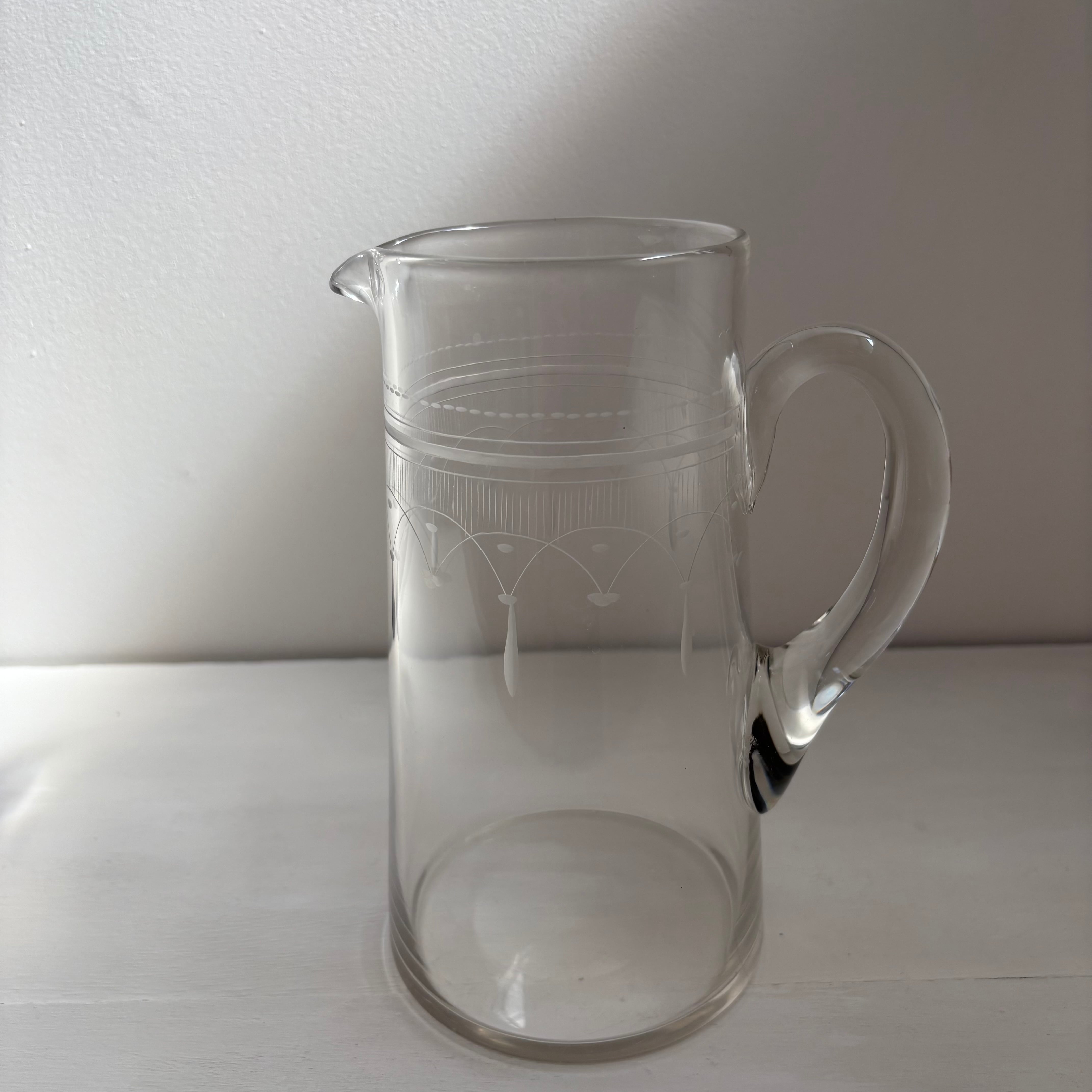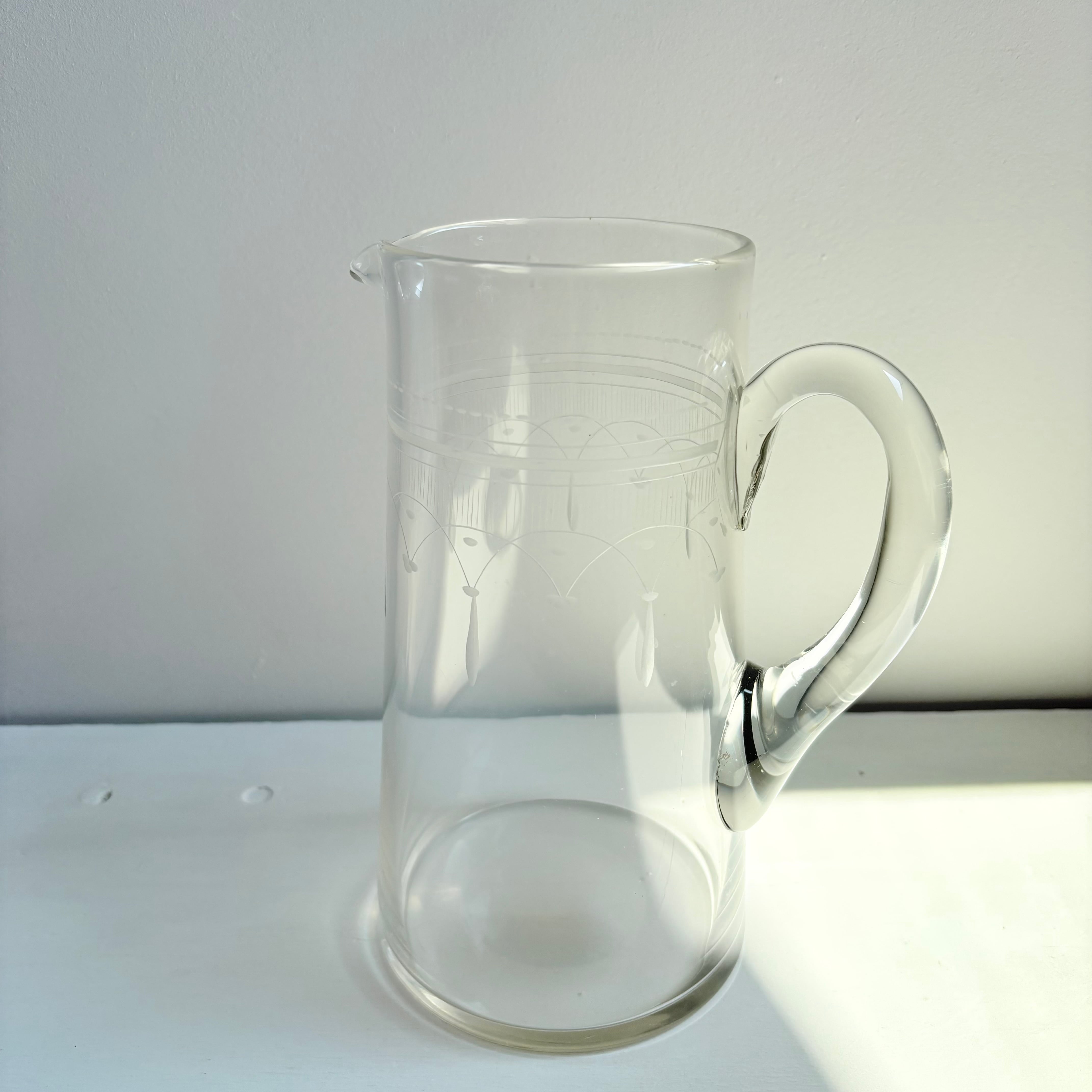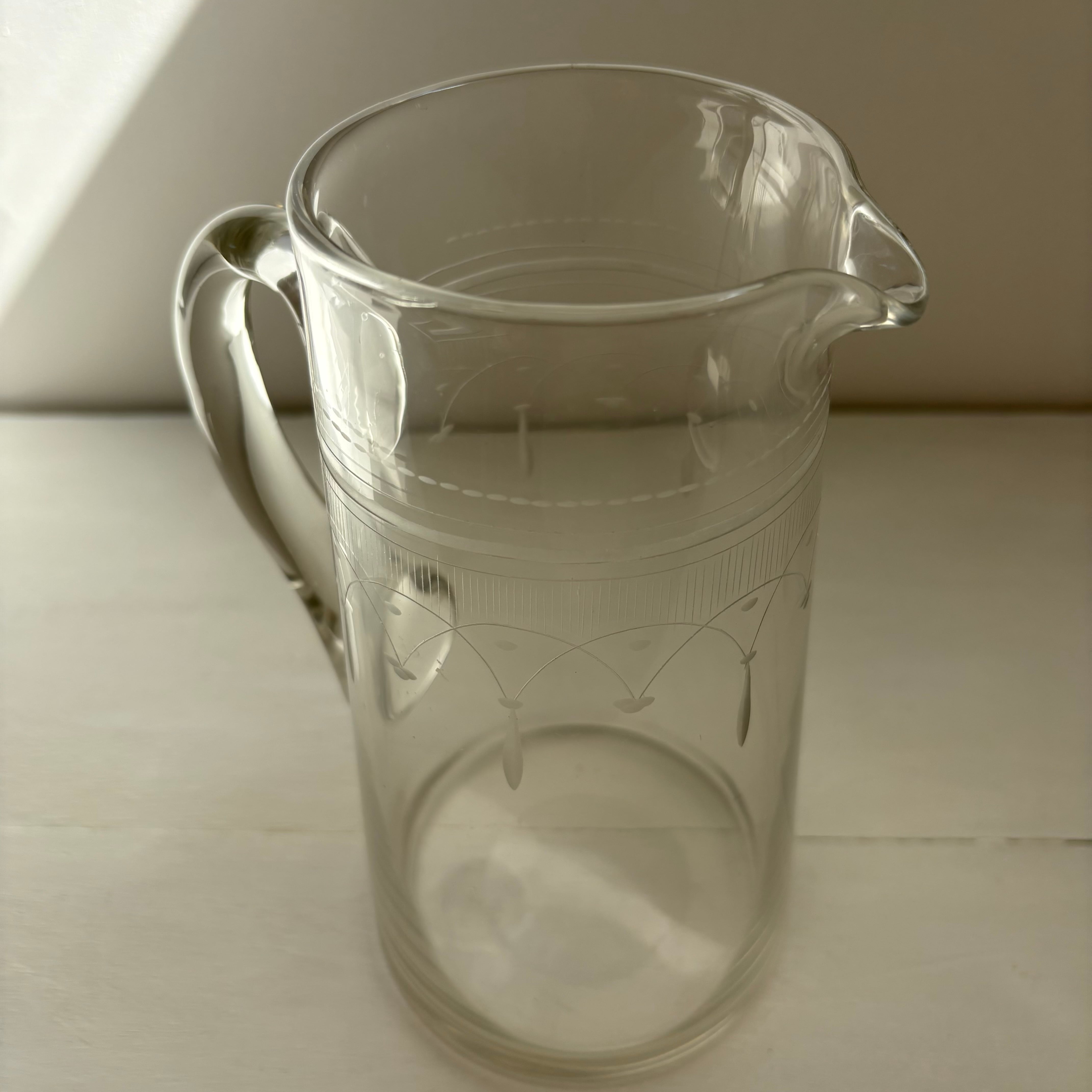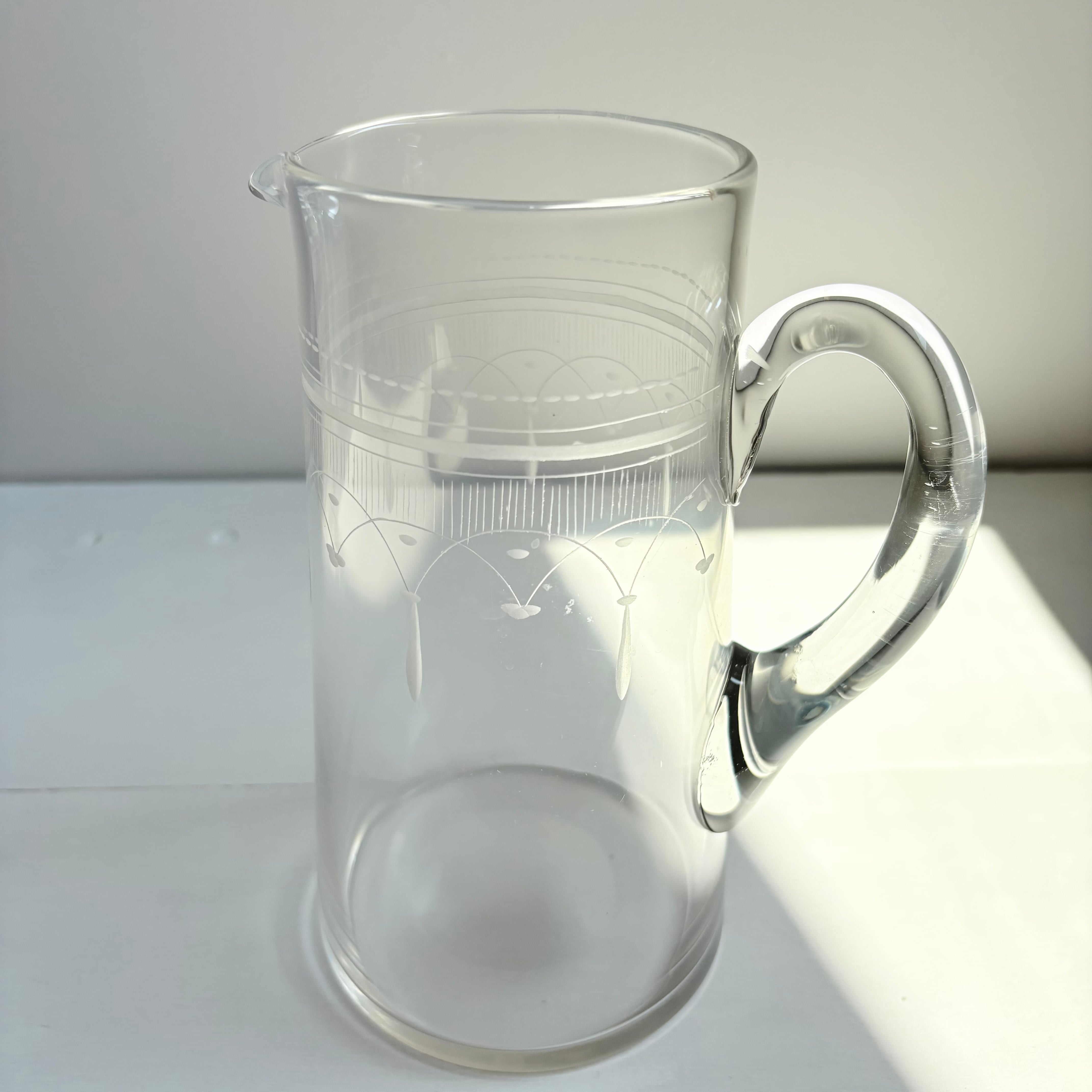 イタリア製 ハンドメイドのガラスピッチャー ・グラスリッツェン・手彫り模様・フラワーベース・水さし・花器・ガラス工芸品(ヴィンテージ雑貨)