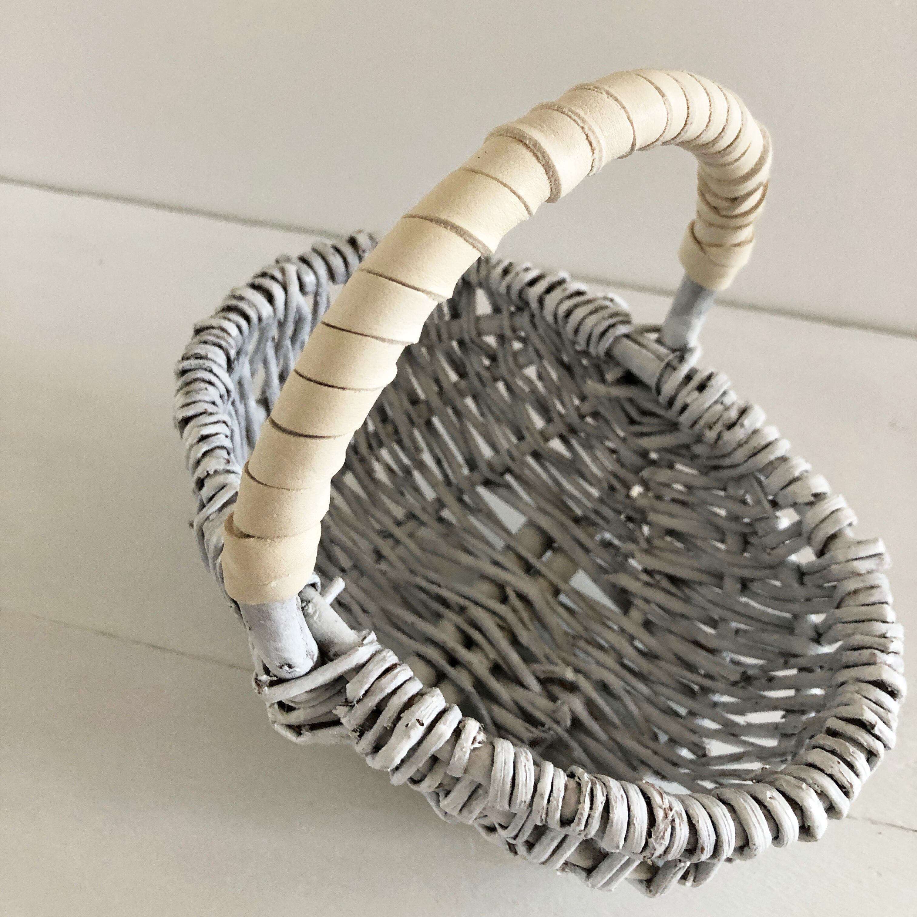 革の持ち手の 白い柳カゴ(ブロカント)・送料無料