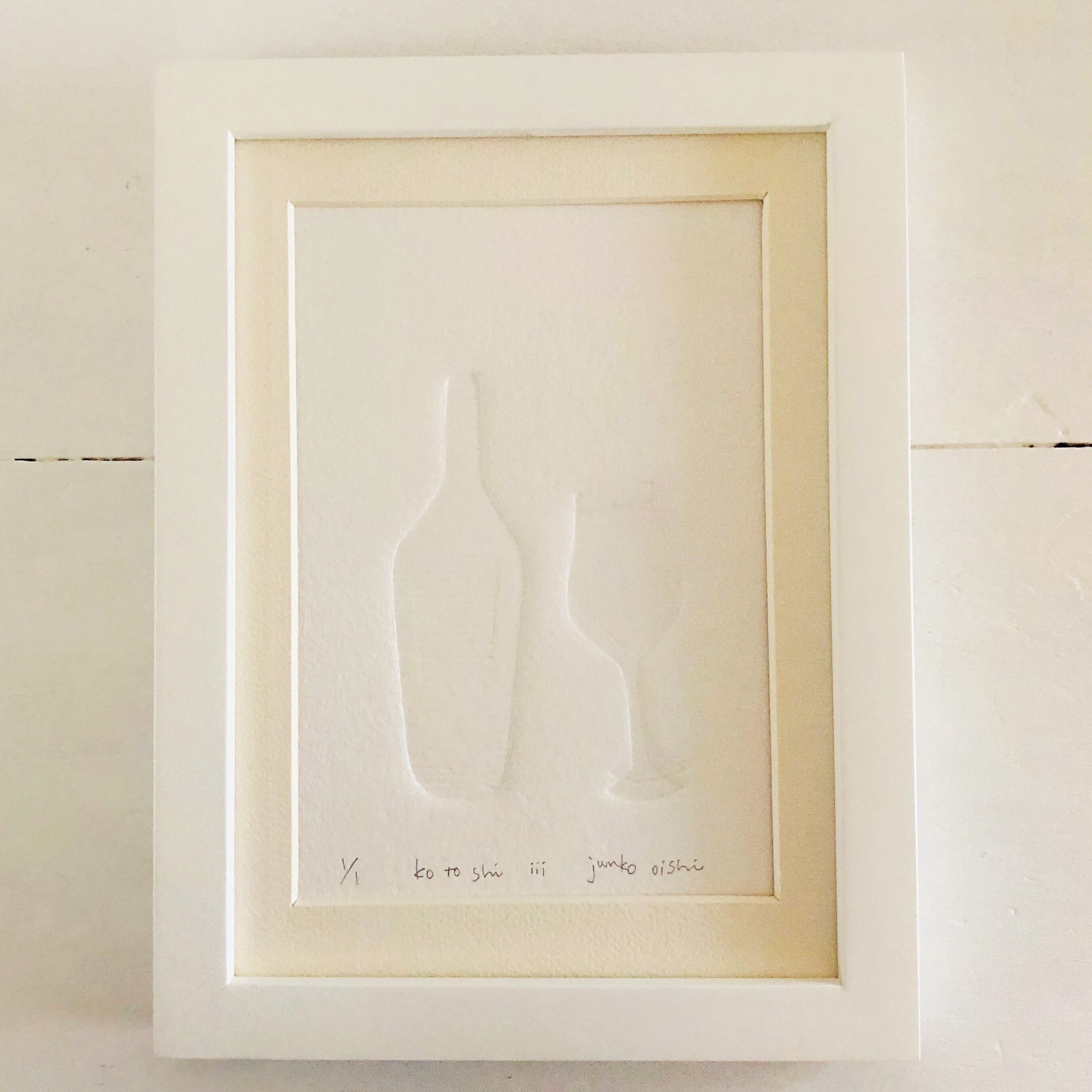 白いグラスとボトルの絵・エンボス作品「 ko to shi ⅲ 」(白い額入り)・送料無料
