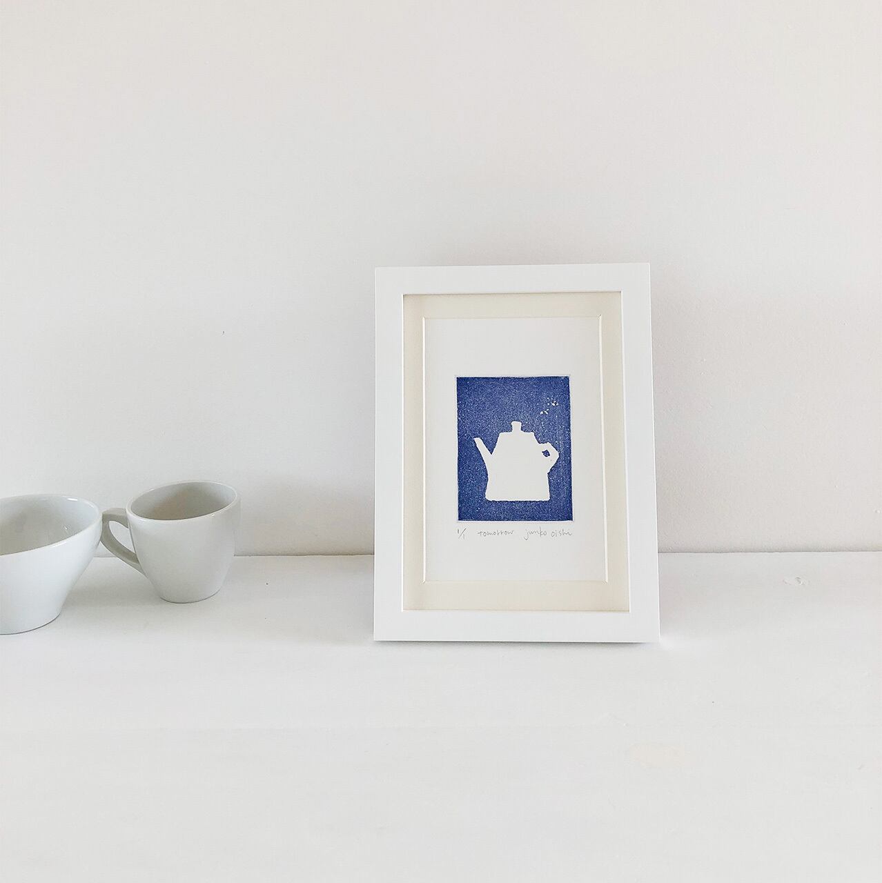 白いポットの絵の銅版画「 tomorrow 」(白い額入り)・送料無料