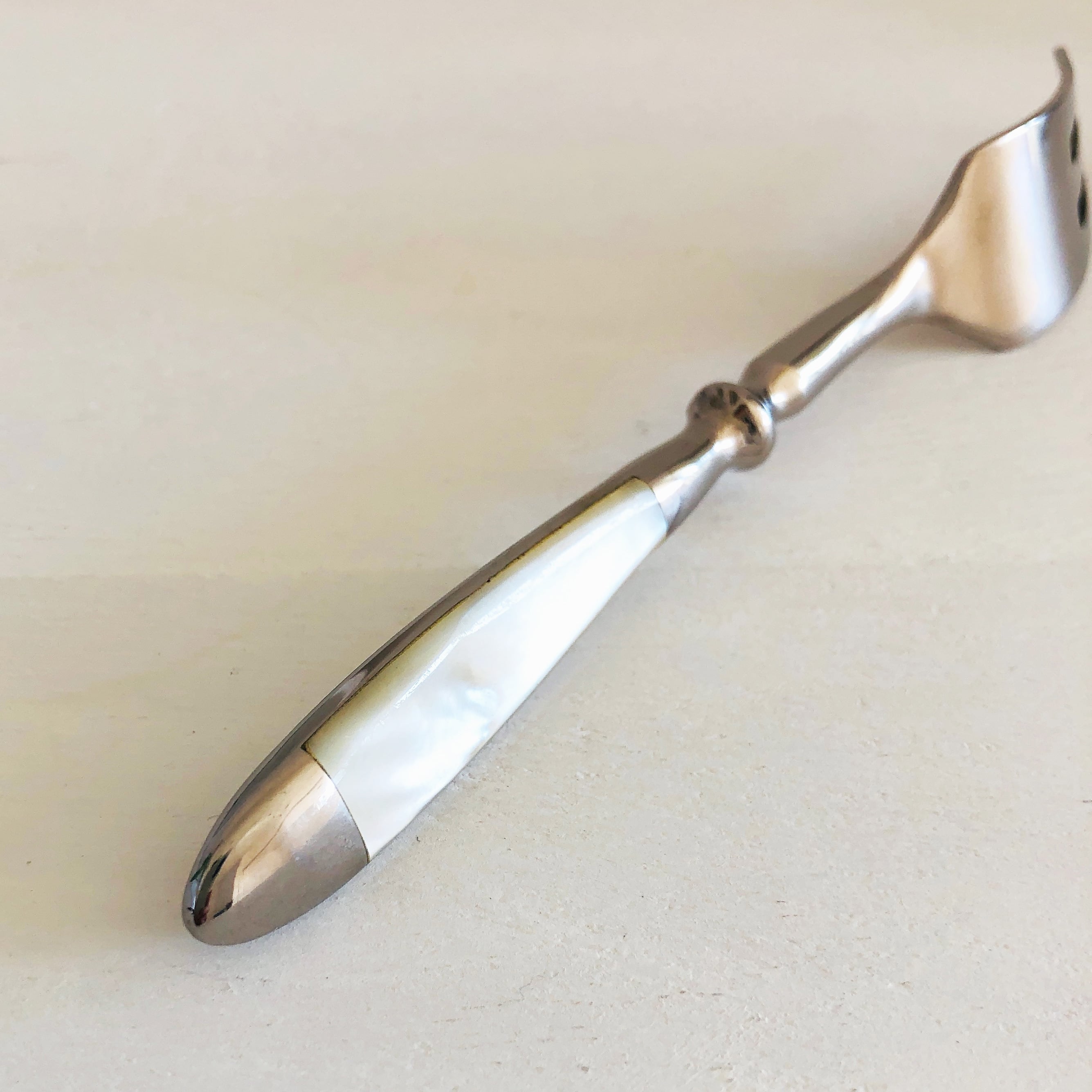 持ち手の上面・下面に貝と思われる白い装飾が施された、シンプルなステンレス製フォークです。